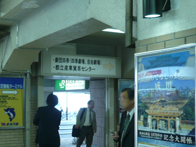 改札を抜けてすぐ、やや右を見ると、「都立産業貿易センター」の案内標識があります。