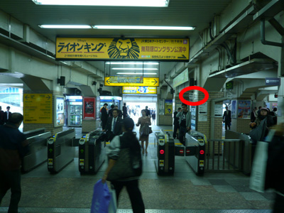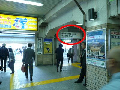 改札を抜けてすぐ、やや右を見ると、「都立産業貿易センター」の案内標識があります。